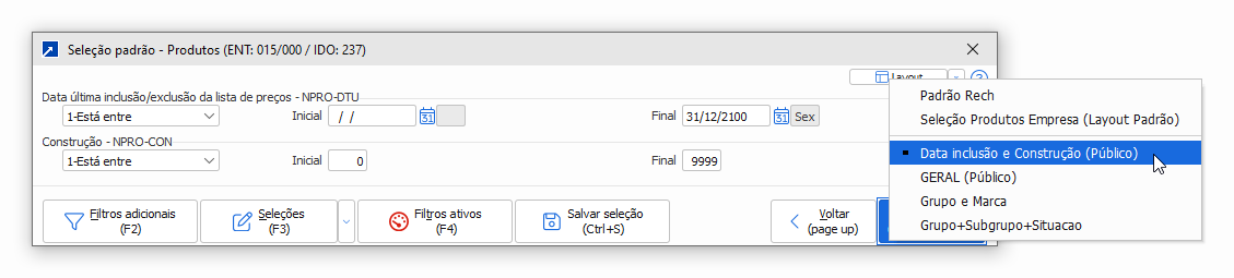 A manutenção dos layouts das seleções são feitas através do botão [Layout] disponível no topo da "Seleção padrão", a partir dele abre a janela de "Gerenciador de Layouts", onde o usuário poderá incluir, alterar, excluir ou importar layouts de outro usuário.