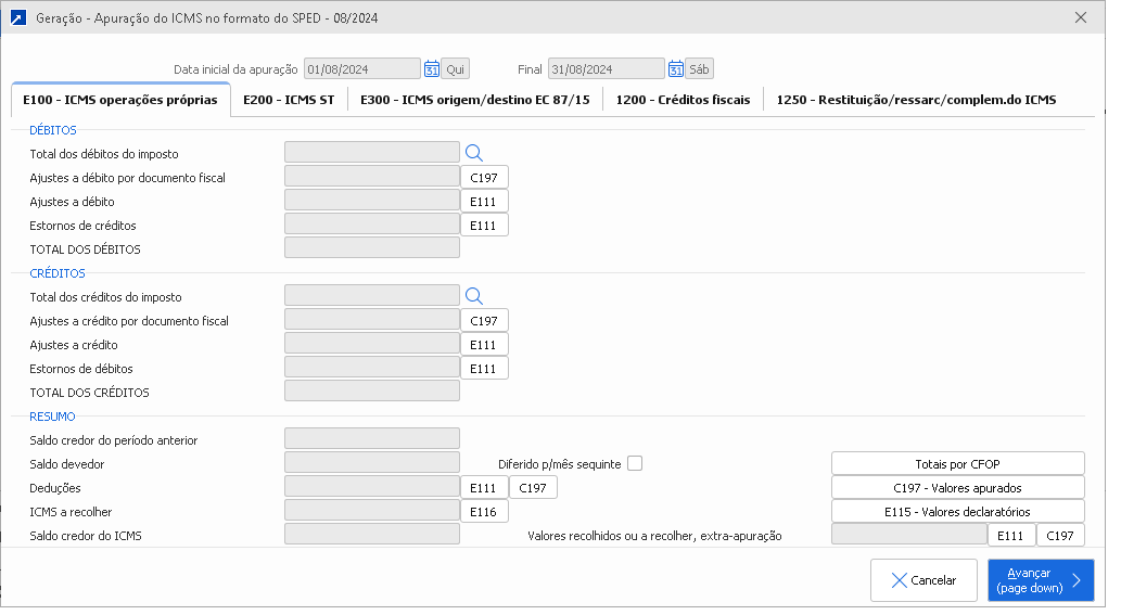 Depois de avançar a tela "Dados complementares da apuração" citada acima será exibida a tela "Geração - Apuração do ICMS no formato do SPED" (exemplificada na imagem abaixo), sendo esta a tela principal da apuração. Nela são apresentados os dados consolidados do período. Para facilitar a conferência as nomenclaturas dos campos seguem as mesmas denominações utilizadas no SPED EFD ICMS/IPI e a apuração está divida em abas separando o tipo de ICMS apurado (E100 - ICMS Próprio, E200 - ICMS ST e E300 - ICMS DIFAL EC 87/15). Além das abas relativas aos registros de apuração de ICMS, a apuração também conta com abas de detalhamento de créditos fiscais (Registro 1200 do EFD ICMS / IPI) e detalhamento de movimentos relativos a restituição, ressarcimento e complemento do ICMS (Registro 1250 do EFD ICMP / IPI). Para mais informações sobre a tela principal da apuração de ICMS .