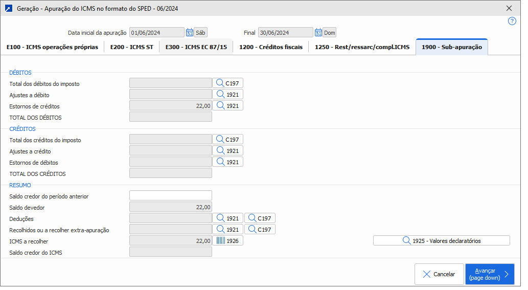 A aba "1900 - Sub-apuração" é destinada a sub-apuração do ICMS, nesta aba estão contemplados os registros 1900 e filhos do EFD.
