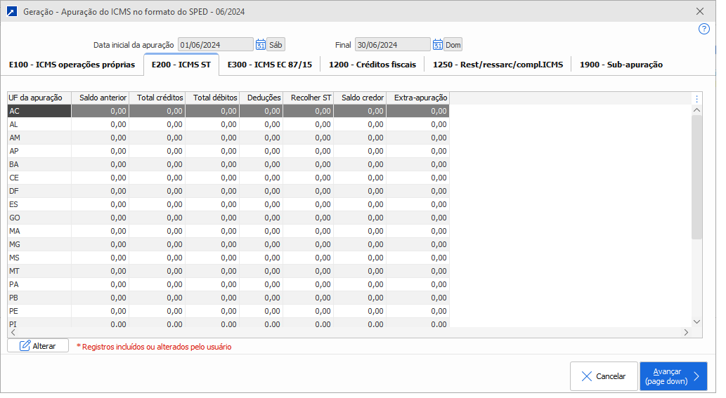 A aba "E200 - ICMS ST" é destinada a apuração do ICMS ST, nesta aba estão contemplados os registros E200 e filhos do EFD ICMS/IPI, os campos da tela apresentam o cálculo do imposto através dos débitos e créditos do período totalizados em linhas por estado.
