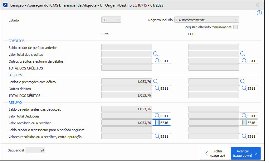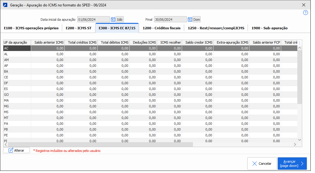 A tela principal do registro E300 demonstra o resultado das apurações de ICMS origem/destino EC 87/15 por estado, para consultar a apuração "aberta" por estado é necessário clicar na linha do estado desejado e então acionar o botão [Consultar] ou botão [Alterar]. Ao acionar um dos botões será exibida a tela de apuração da UF selecionada, abaixo consta um exemplo da tela de apuração.