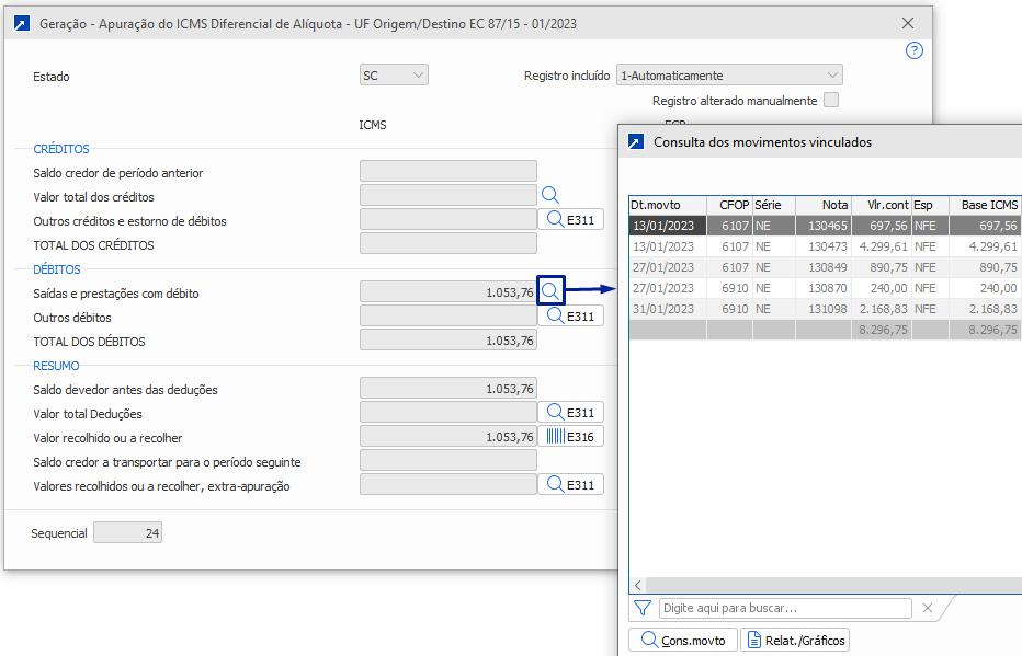 Na tela da apuração do ICMS origem/destino por UF é possível consultar o detalhamento de movimentos a débito e crédito que compõem os valores demonstrado nos campos da apuração. A consulta de movimentos vinculados ao campos com origem de notas fiscais, como por exemplo, o campo "Saídas e prestações com débito", é feita utilizando o botão em formato de lupa localizado ao lado do valor, ao acionar o botão será exibida a tela formato de grid exemplificada abaixo.