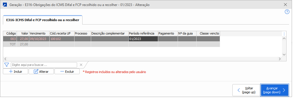 Já os movimentos de ajustes a débito e crédito E311 e o registro com as informações de recolhimento E316, possuem a possibilidade de manutenção dos dados, sendo possível consultar, incluir, alterar e excluir informações destes registros através dos botões [E311] e [E316], o padrão de manutenção segue o mesmo em todos os registros, na parte inferior da tela estão disponíveis os botões para inclusão, alteração, consulta e exclusão, vide exemplo abaixo onde conta a tela do registro E316: