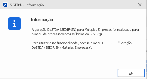 A geração do arquivo DeSTDA (SEDIF/SN) para múltiplas empresas agora está disponível no menu LFI 5.9-S. Essa opção permite gerar a Declaração de Substituição Tributária, Diferencial de Alíquotas e Antecipação (DeSTDA) para várias empresas de forma simultânea, com a seleção das empresas feita no momento da geração. A opção "Múltiplas empresas" não aparece diretamente nesse menu, pois sua funcionalidade já está integrada à rotina de geração desse processo.