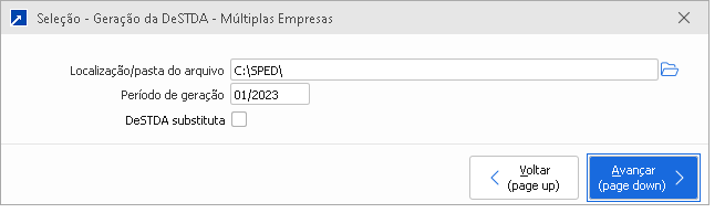 Esta janela permite gerar a Declaração de Substituição Tributária, Diferencial de Alíquotas e Antecipação (DeSTDA), exigida para contribuintes do Simples Nacional com operações interestaduais sujeitas à substituição tributária. Essa opção de geração pode ser acessada pelo menu LFI 3.9-T.
