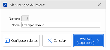Ao clicar o botão de incluir novo layout, indicado pelo símbolo "+", vai abrir a seguinte tela que permite configurar um nome e as colunas do layout novo. Estas colunas correspondem aos campos do registro de movimentos de ISS. O botão ao lado é o de alterar, vai abrir esta mesma tela de alteração para a opção selecionada.