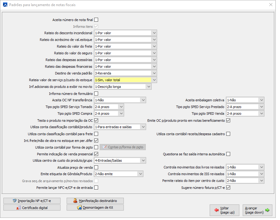 No módulo de Livros Fiscais, menu 1.2-A, botão [Lançamento NF], a configuração "Rateia valor de serviço p/custo do estoque" deve estar configurada com a opção 1 ou 3, sendo que a diferença entre elas é o crédito ou não dos impostos sobre o valor do serviço que será agregado ao movimento de estoque do item referenciado.