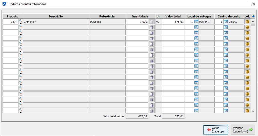 No lançamento de notas fiscais de retorno de mercadorias remetidas para industrialização por encomenda (enquadram-se nesse caso as notas fiscais com CFOP 1.902/2.902 e 1.925/2.925), quando não há saldo a retornar no "Controle de Beneficiamento de Terceiros (Cód.: 32)" (ou quando este adicional não estiver contratado), e o sistema estiver configurado para controlar a entrada interna de produtos prontos (), serão aceitos ao final do lançamento da nota fiscal a janela para informar os produtos prontos retornados do processo de industrialização.