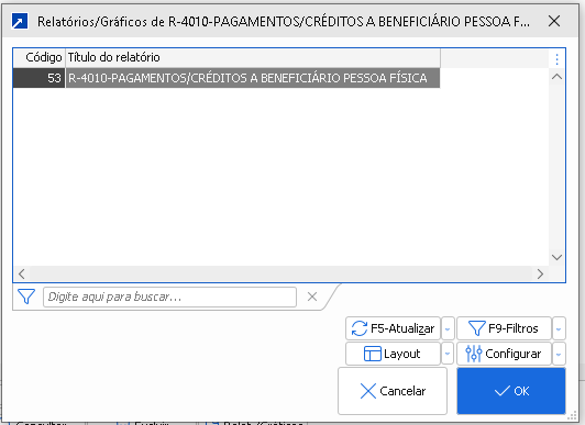Botão utilizado para acessar os relatórios e ou gráficos do Gerador de Relatório da tabela de movimentos Sped Reinf. Clicando no botão será aberta a janela exemplificada abaixo na qual pela qual será possível listar relatórios criados anteriormente no gerado.