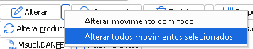 Botão utilizado para alterar o movimento em foco, equivale as rotinas LFI 2.1-A, EST 2.3-A e COM 3.1-A. Para alteração de múltiplos movimentos selecionados no grid dinâmico pode ser acionada a função secundária do botão clicando na seta a direita e posteriormente na opção "Alterar todos os movimentos selecionados", vide exemplo abaixo.