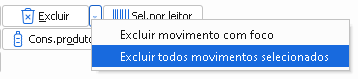 Botão utilizado para excluir o movimento em foco, equivale as rotinas LFI 2.1-E, EST 2.3-E e COM 3.1-E. Para exclusão de múltiplos movimentos selecionados no grid dinâmico pode ser acionada a função secundária do botão clicando na seta a direita e posteriormente na opção "Excluir todos os movimentos selecionados", vide exemplo abaixo.
