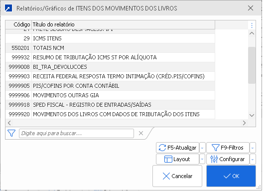 Botão utilizado para acessar os relatórios e/ou gráficos do Gerador de Relatórios da tabela de itens dos movimentos dos livros. Ao acionar o botão, abrirá a janela exemplificada abaixo na qual será possível listar relatórios criados anteriormente no gerador.
