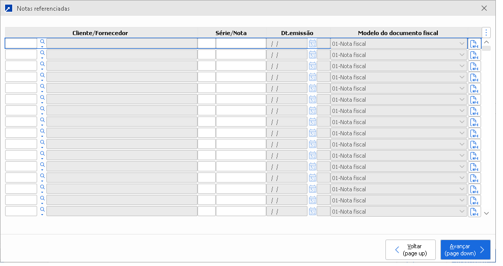 Para informar documentos referenciados acessar o botão [Notas referenciadas] ao acessar o botão será aberta a janela abaixo onde poderão ser informados os documentos referenciados.