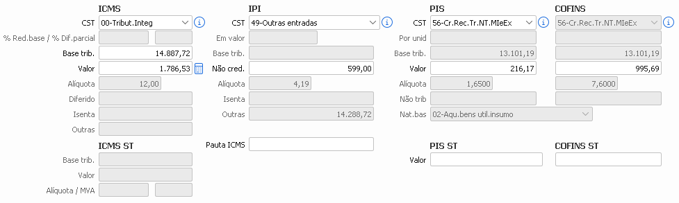 Os campos listados na imagem abaixo são responsáveis por receber as informações dos impostos do item escriturado, é de extrema importância que as informações inseridas nos campos sejam feitas corretamente, pois irá impactar nas apurações dos impostos.