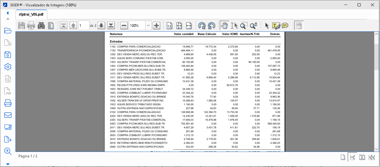 O relatório é listado no padrão RFP, permitindo uma personalização das informações caso o usuário queira modificar algo.