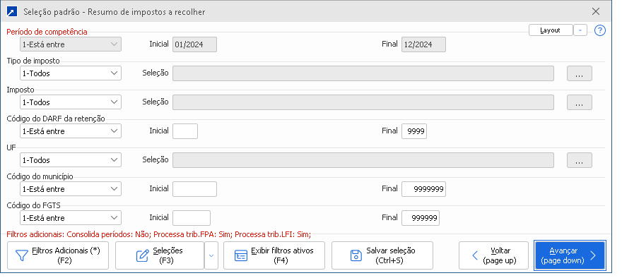 Além disso, o campo "Código do FGTS" ficará disponível exclusivamente quando o imposto "FGTS folha" for escolhido para processamento. Ao avançar na tela "Seleção padrão - Resumo de impostos a recolher", o relatório será gerado automaticamente se o campo "Múltiplas empresas" estiver configurado como "1-Não" na janela de seleção inicial.