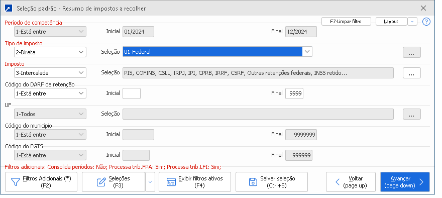 É importante destacar que alguns filtros na tela de seleção padrão serão habilitados conforme o tipo de imposto escolhido para a listagem. Por exemplo, o campo "Código do DARF da retenção" estará disponível apenas quando o processamento envolver impostos federais e determinados impostos trabalhistas. Da mesma forma, o campo "UF" será habilitado para processamentos que envolvem impostos estaduais, enquanto o campo "Código do município" será ativado ao selecionar um imposto municipal.
