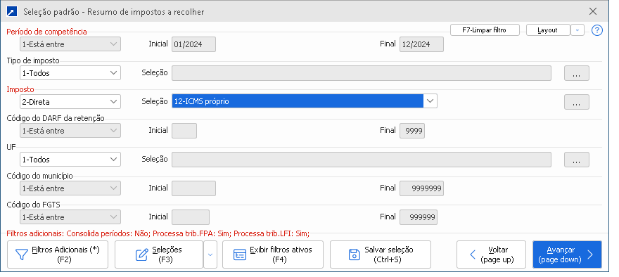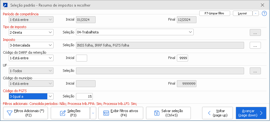 Exemplo 4: Este último exemplo demonstra uma configuração de seleção para listar apenas impostos trabalhistas, filtrando especificamente os dados do FGTS com o código 15.
