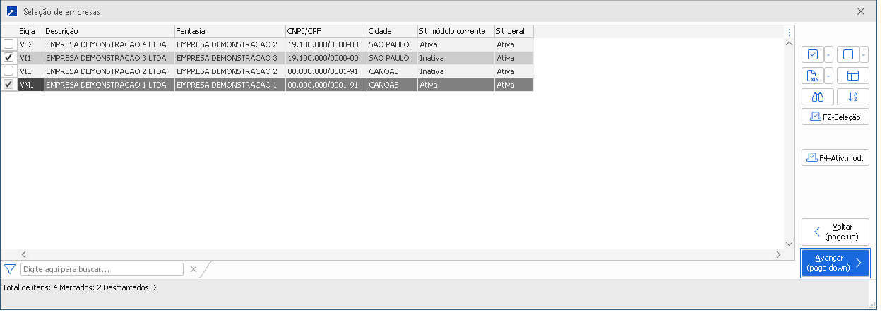 Caso opte por processar múltiplas empresas, uma nova tela será exibida para que o usuário selecione as empresas a serem incluídas no relatório. Após avançar nesta tela de seleção, o relatório será gerado e exibido.