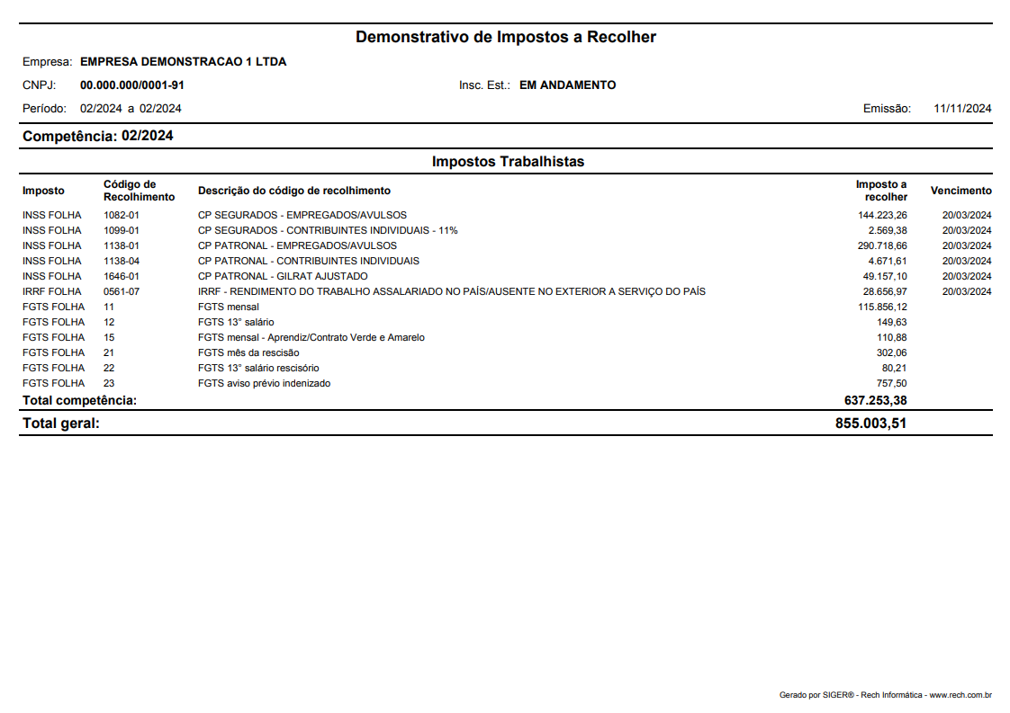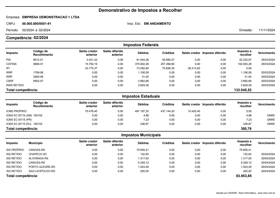 Abaixo está um exemplo do relatório Demonstrativo de Impostos a Recolher gerado pelo SIGER®.