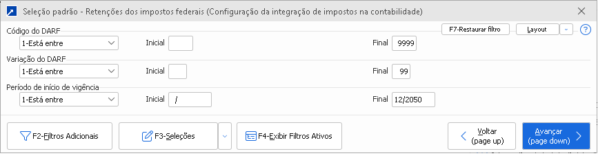 Ao acessar o menu LFI 2.9-Y será exibida a janela de "Seleção padrão conforme imagem acima, no primeiro acesso não é necessário efetuar filtros visto que ainda não existem configurações feitas, pode-se simplesmente avançar a até a janela Configurações da integração da retenção de impostos no financeiro exibida e com orientações para configurações abaixo. Para acessos futuros a rotina LFI 2.9-Y a janela de Seleção padrão pode ser útil para consultar configurações por código de DARF, Variação do DARF e período de vigência das configurações efetuadas.