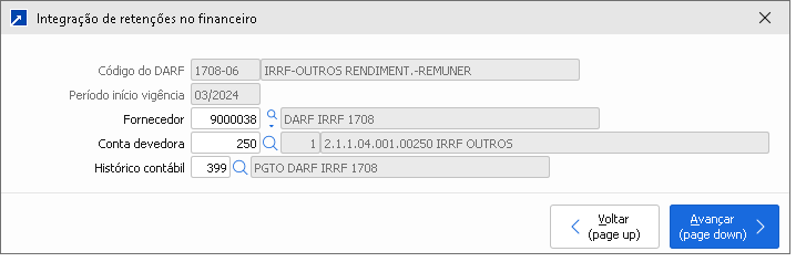 Para empresas que não precisam controlar no financeiro e contabilidade as retenções de IR por código de DARF, não é necessário efetuar estas configurações, basta informar os dados da integração na manutenção de empresas.