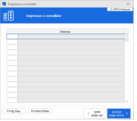 Ao acessar o botão irá exibir a janela para definir quais as empresas devem consolidar na listagem.