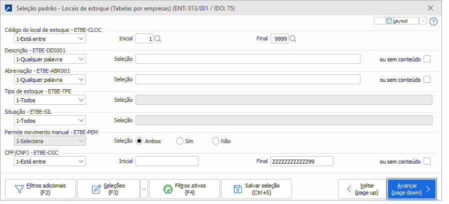 Ao acessar o botão irá exibir a janela para definir o filtro dos locais de estoque que devem ser processados na listagem.