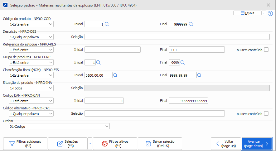 Somente, cfe.cadastro formul. - O sistema processará exclusivamente os produtos que possuam formulação cadastrada, ignorando itens que não façam parte de nenhuma estrutura de produto. Indicado para controle de produtos formulados ou produzidos internamente.