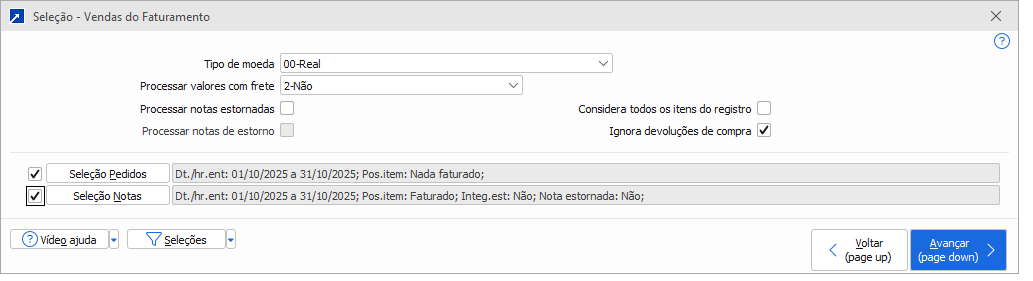 Seleção de pedido e notas que serão processados para a listagem.