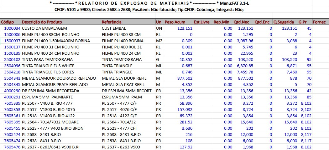 O relatório Listagem da Explosão de Materiais apresenta de forma detalhada a estrutura dos produtos formulados, exibindo todos os componentes e matérias-primas que compõem cada item. Esse relatório permite visualizar a relação hierárquica entre o produto acabado e seus respectivos insumos, servindo como referência para o controle de produção, planejamento de compras e rastreabilidade dos materiais utilizados nas formulações.