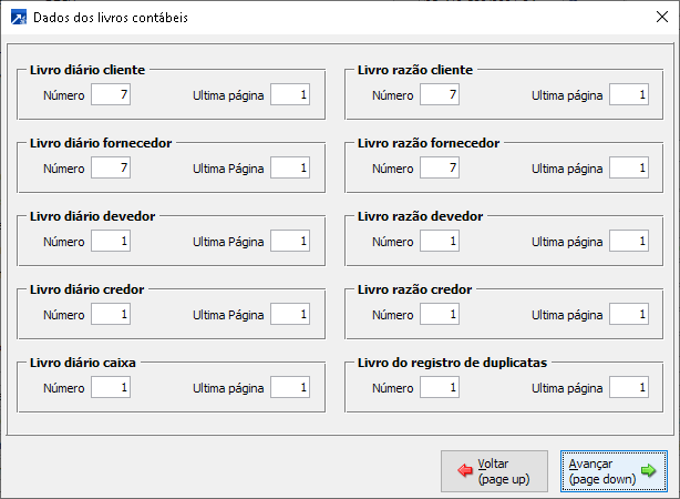 Livros contábeis Neste botão estão disponíveis as configurações para número e páginas para os livros diários e razões auxiliares, porém não há mais obrigatoriedade da emissão dos mesmos.