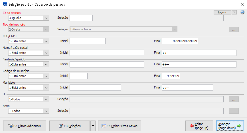 Este botão acessar a "Seleção padrão - Cadastro de pessoas", neste menu o campo "Tipo de inscrição" traz a seleção fixada em "F-Pessoa física", essa seleção define os cadastros que serão exibidos na manutenção consolidada.