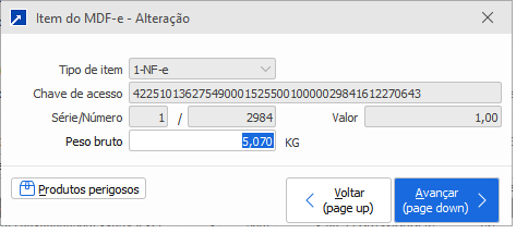 Podemos alterar a questão de peso bruto da nota/item selecionado e no botão Produtos perigosos, o número ONU/UN