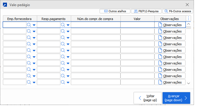 Inclusão dos vales pedágio para o percurso do MDF-e. O campo "Núm. do compr. de compra" é alfanumérico e podem ser informados 20 caracteres.