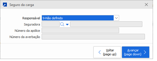 Nesse botão é possível determinar quem seria responsável pelo transporte, se necessário indicar uma seguradora responsável por esse transporte e informar o número da apólice de seguro.