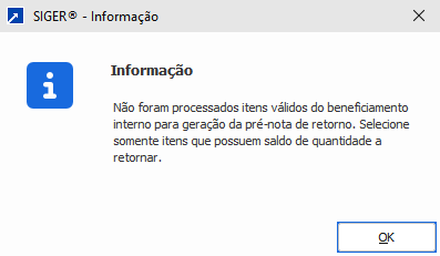 Caso seja exibida a seguinte mensagem ao tentar realizar uma NF de retorno de beneficiamento.