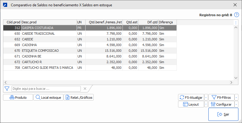 Dica: o processamento da comparação entre o saldo das notas de beneficiamento e acumulados de estoque é feito na tabela virtual "690-COMPARATIVO DE SALDOS DO BENEFICIAMENTO X SALDOS EM ESTOQUE".