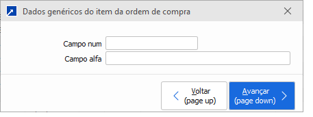 Observação: O botão para acessar a janela é exibido na manutenção somente se algum dos campos genéricos estiver disponível para alteração. Os campos são habilitados quando seu rótulo é preenchido nos Parâmetros do Sistema - Compras. + Saiba mais