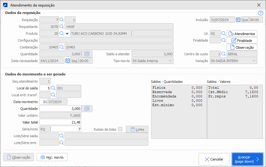 Atende o item da requisição selecionado no grid, fazendo uma saída ou transferência do material do estoque.