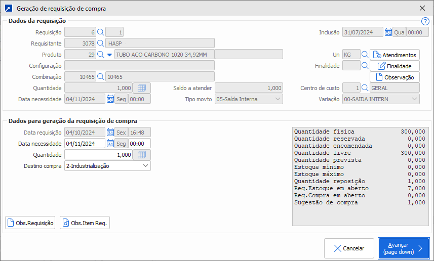 Na geração de requisição de compra individual aceita janela para informar os dados da requisição de compra, inclusive a quantidade, cujo é sugerido o Saldo a atender disponível.