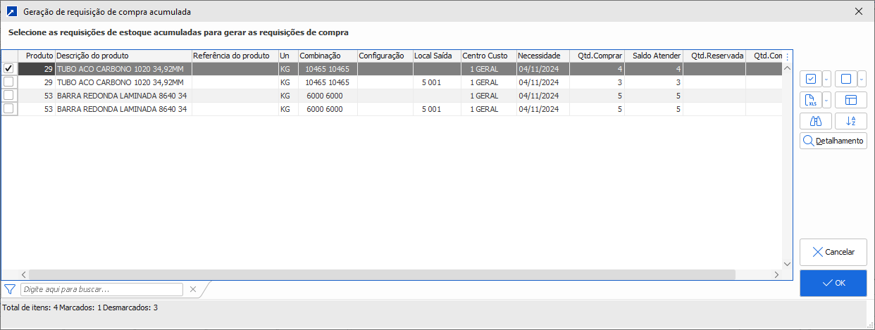 No botão [Detalhamento] exibe os itens de requisições que foram agrupados (abaixo):