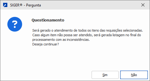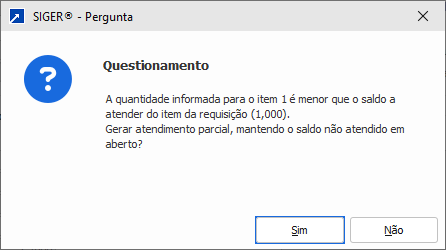 Quando a quantidade atendida é menor que a quantidade total do item da requisição, o sistema exibe mensagem questionando se deve permanecer o saldo em aberto (abaixo):