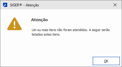 Caso algum item não possa ser atendido, será exibida mensagem (abaixo), e na sequência um relatório de inconsistência