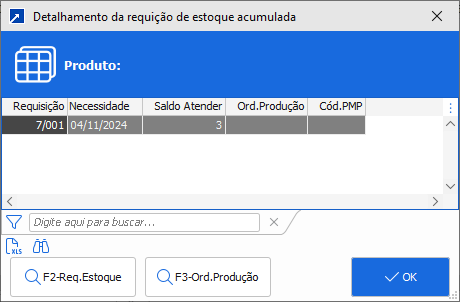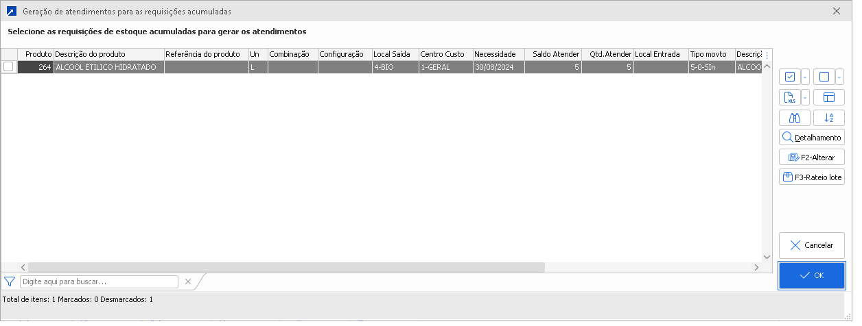 Abre janela APENAS com com o produto do item de requisição selecionado no grid (manutenção consolidada), acumulando suas quantidades em um novo grid. A janela é semelhante aos prints anteriores da segunda opção.