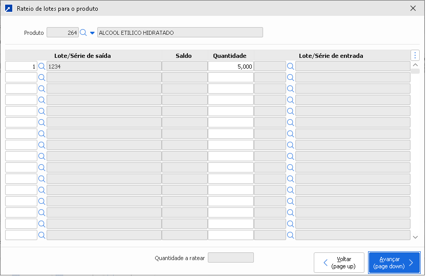 No botão [F3-Rateio lote] exibe a janela de rateio de lotes para o produto: