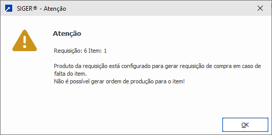 É necessário que o tipo de ressuprimento do item (cadastro do produto, botão [Estoque/Compras]) seja "1-Gera OP" ou "2-Manual (padrão Gera OP)", caso contrário será exibida mensagem informativa (abaixo):