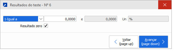 O campo "Resultado zero" é aceito na janela de resultado para indicar que o teste foi executado e o resultado obtido é zero. Se desmarcado, considera que o teste não foi executado.