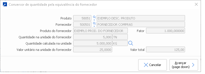 Utilize o atalho "F3-Fator de conversão" para calcular a quantidade do item da ordem de compra a partir do fator de conversão cadastrado nas equivalências do produto para o fornecedor. Aplicável quando o fornecedor controla o produto em unidade de medida diferente da unidade do produto cadastrado no SIGER®. + Saiba mais