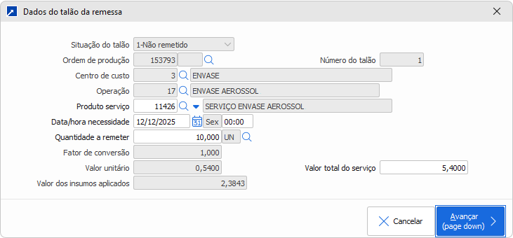 Calculado a partir da quantidade a remeter, valor unitário e fator de conversão do talão.